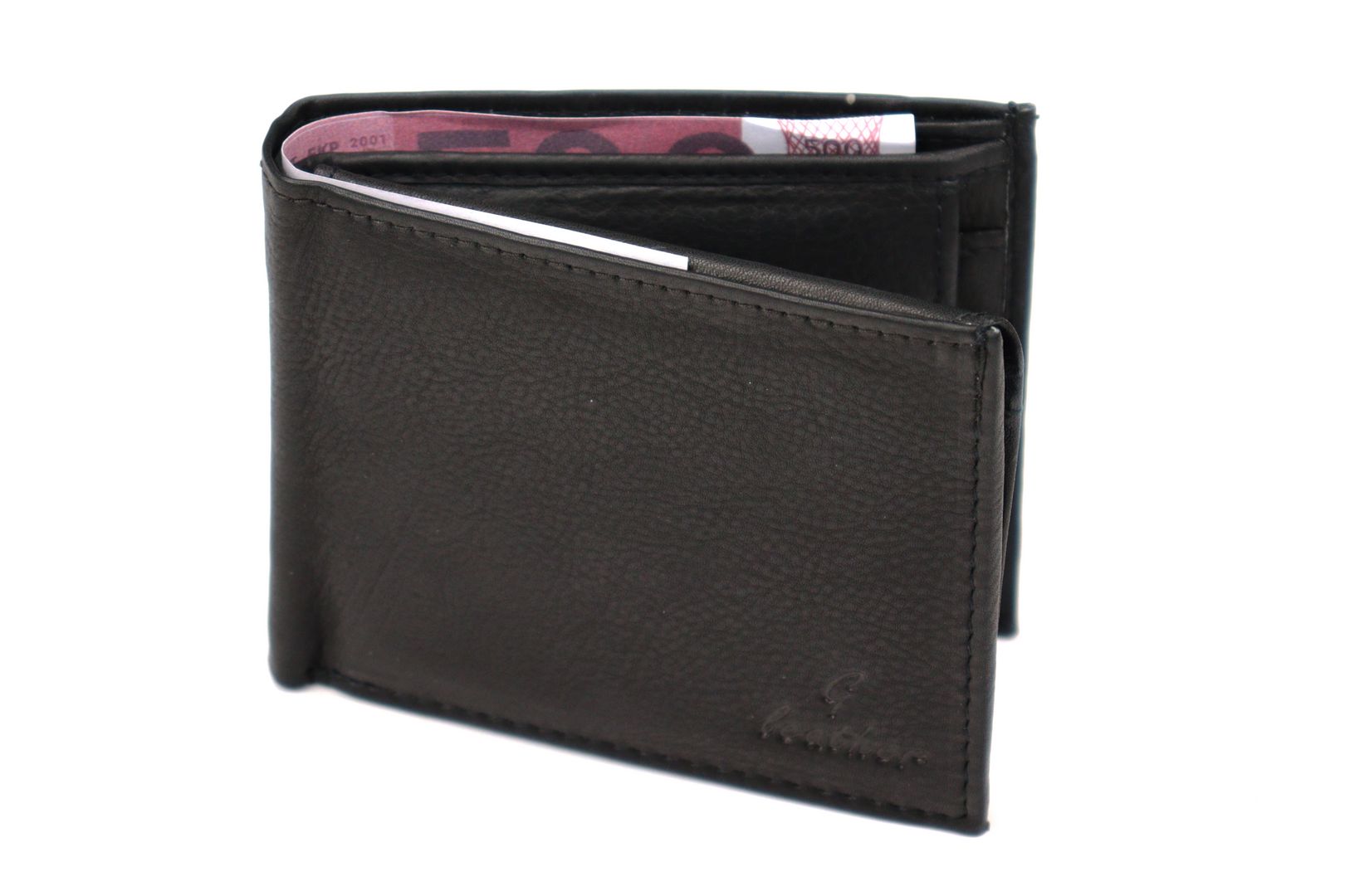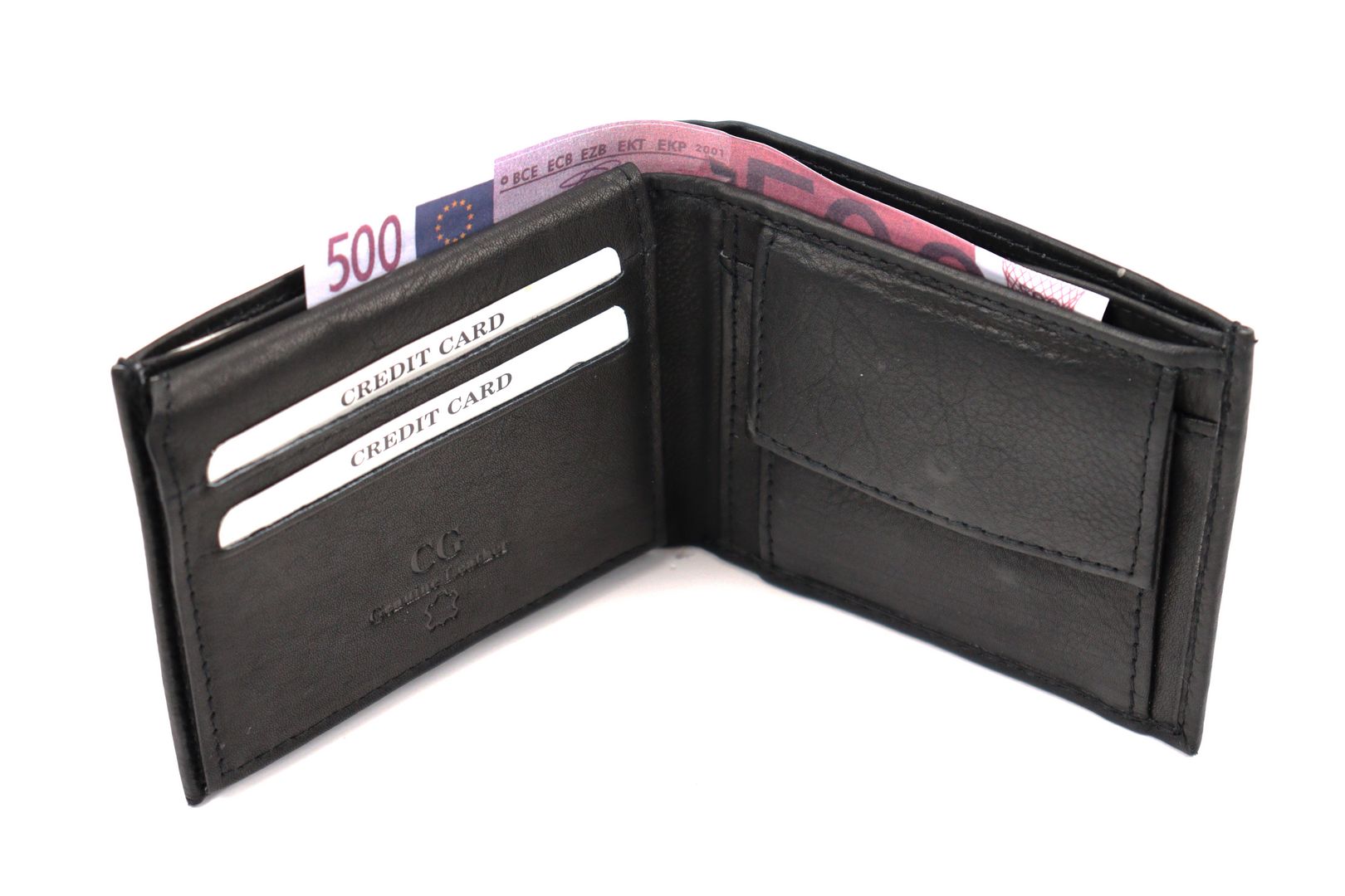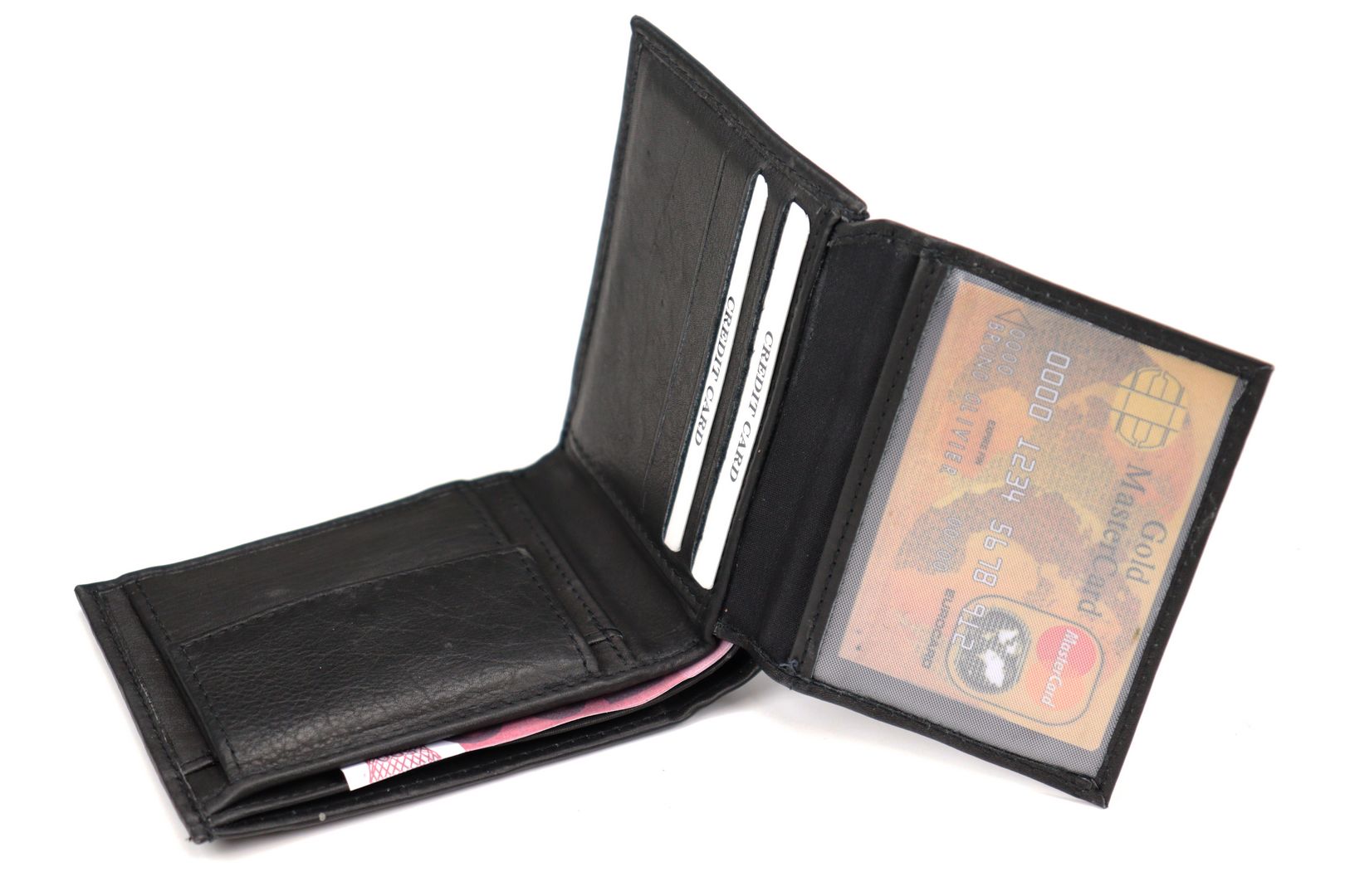 Genuine soft leather men's wallet with 2 bill slots, 1 transparent slot, 1 coin pocket, 6 credit card slots and 2 extra slots.