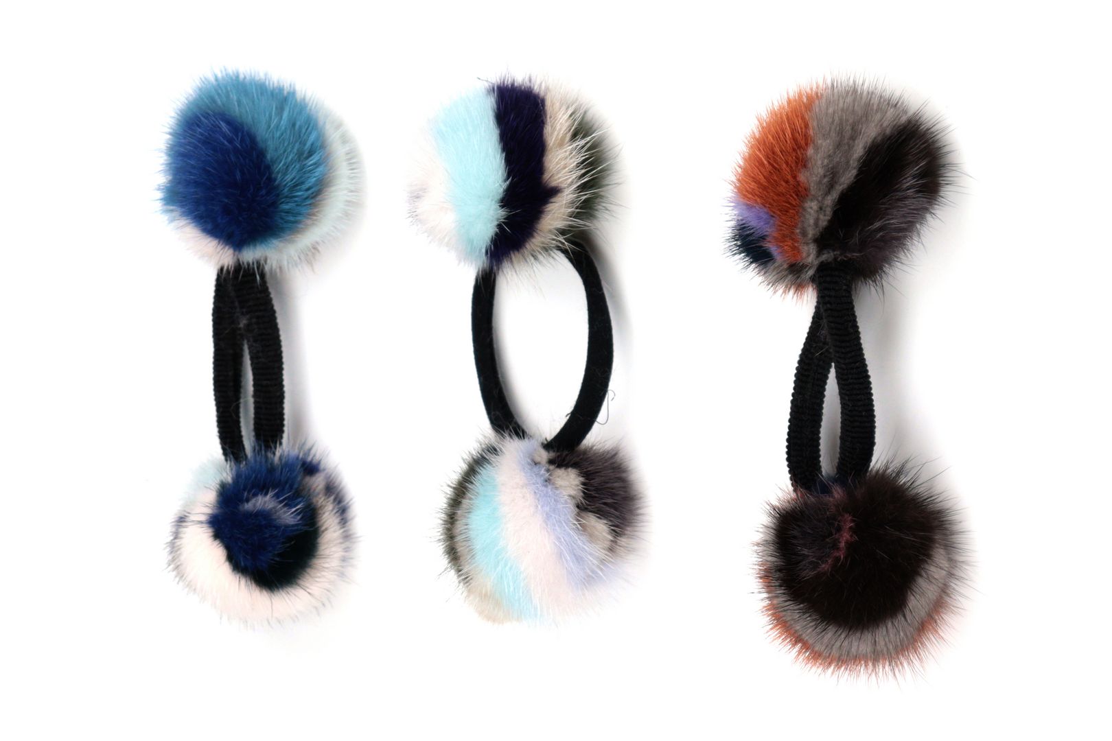 Κοκαλάκι μαλλιών με λάστιχο επενδυμένο με ύφασμα για να μην σπάει την τρίχα και 2 πομ-πομ διαμέτρου 5cm από φυσική γούνα βιζόν.
